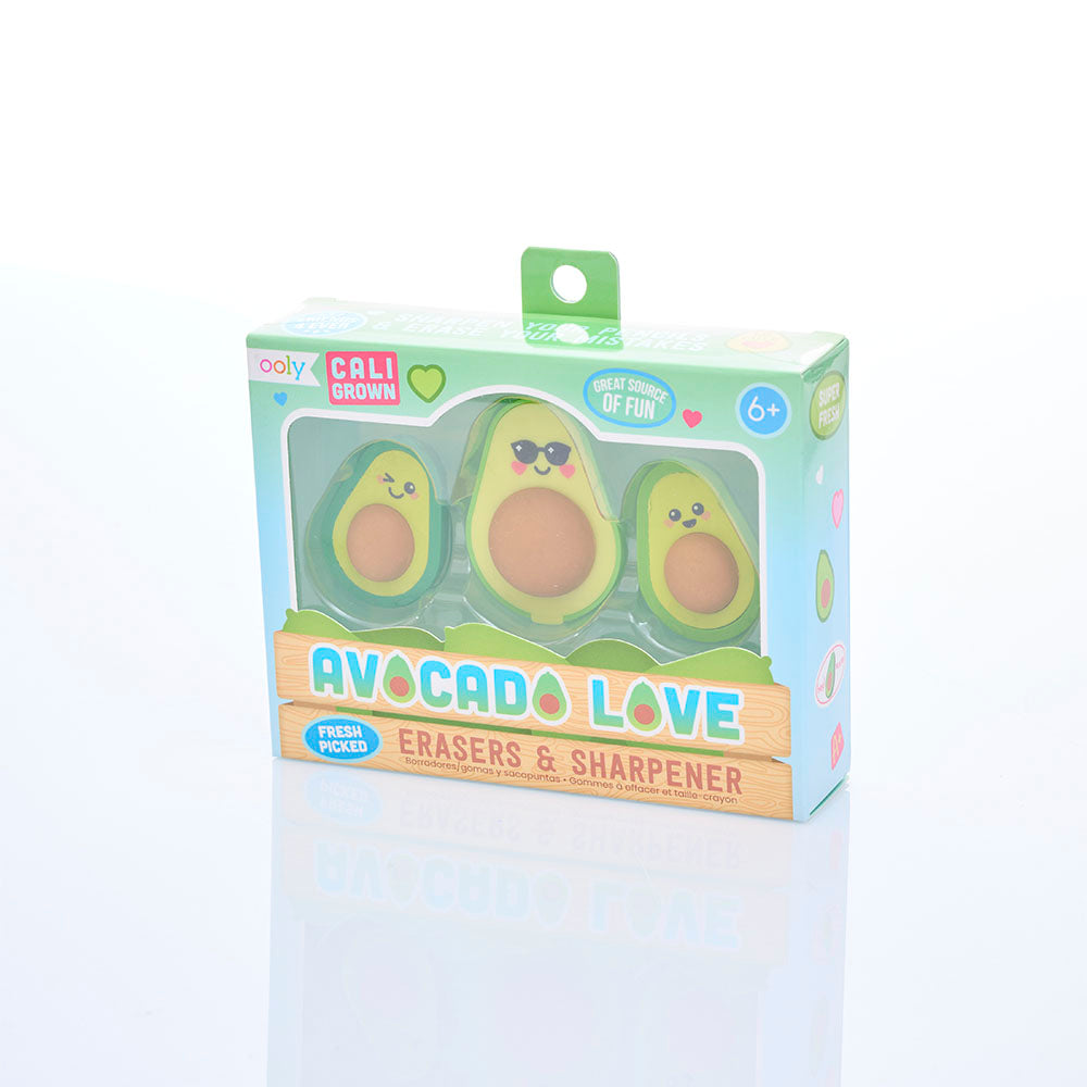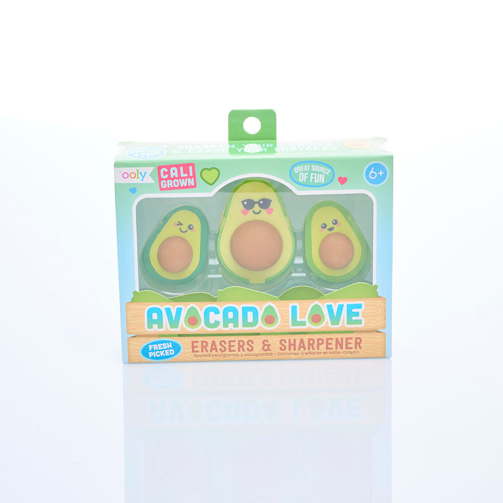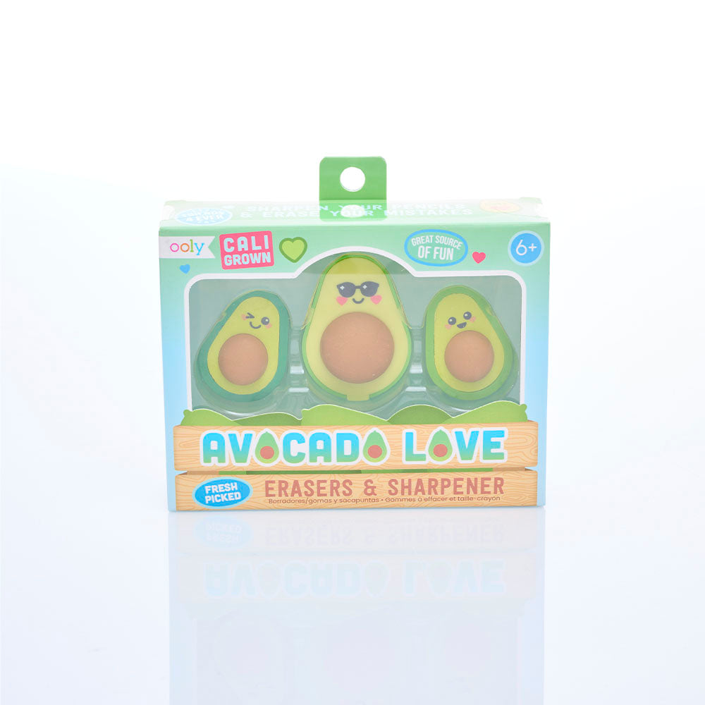 Set con 2 borradores con forma de aguacate y un sacapuntas más grande con forma de aguacate