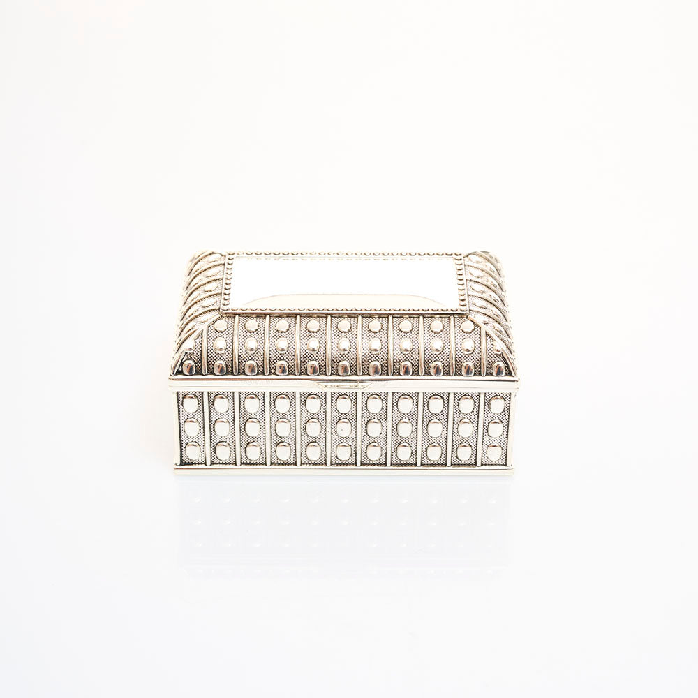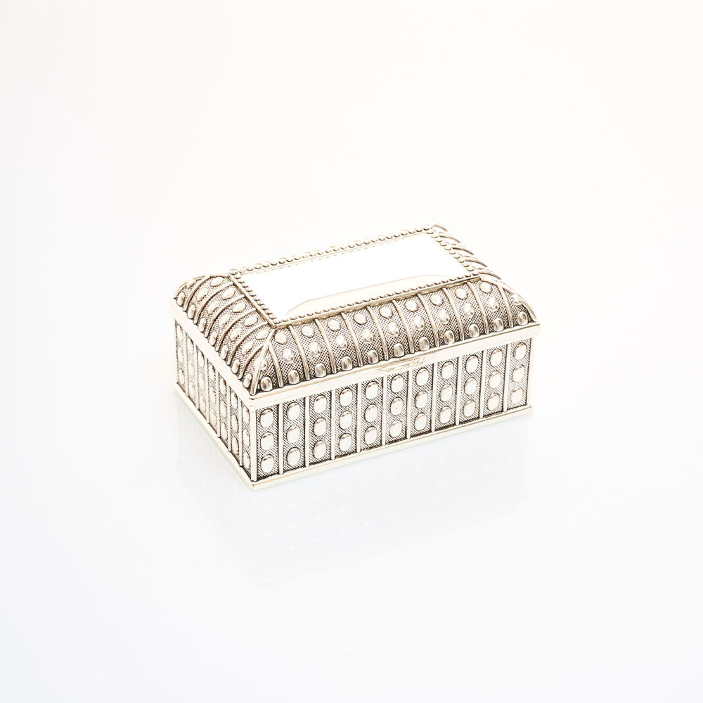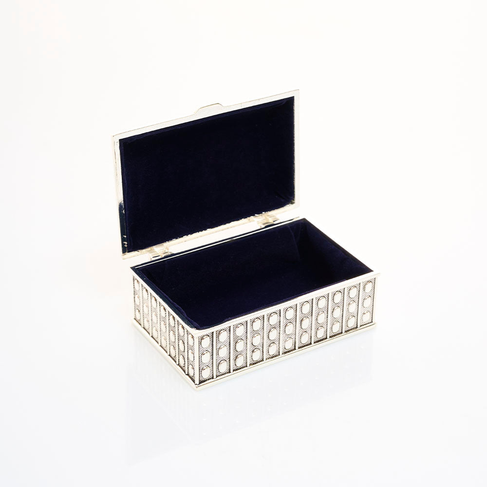 Joyero de acero inoxidable. Medidas: 8.5 x 5.5 x 4.5 cm de altura.