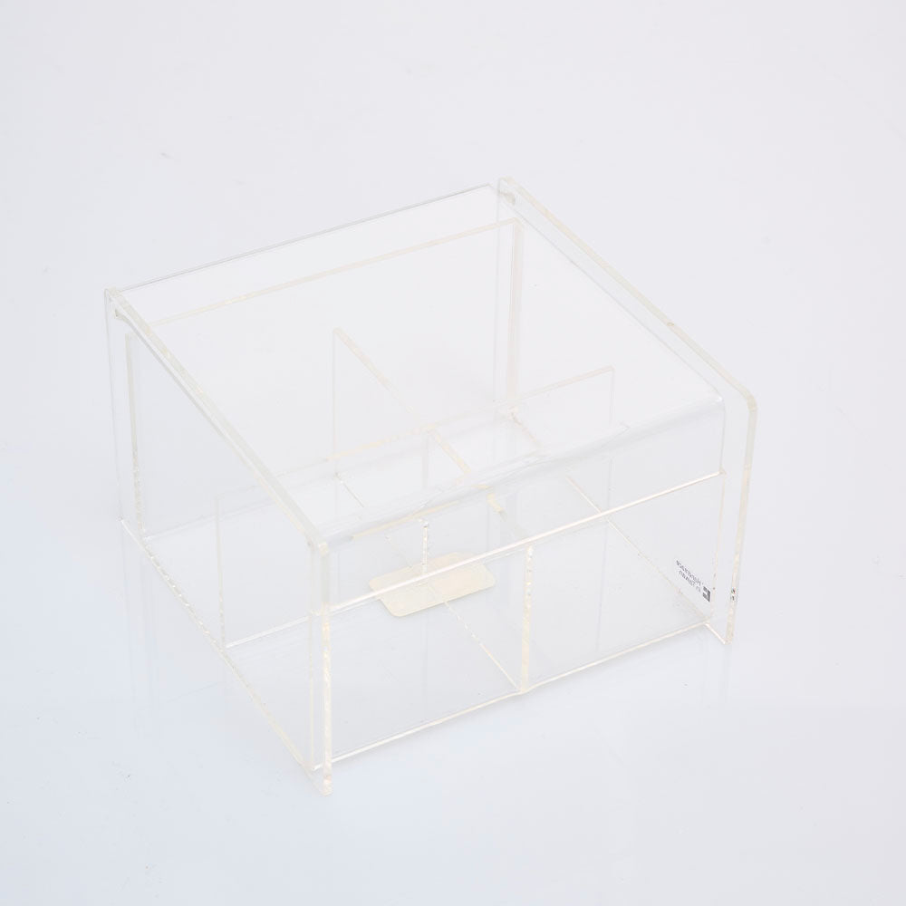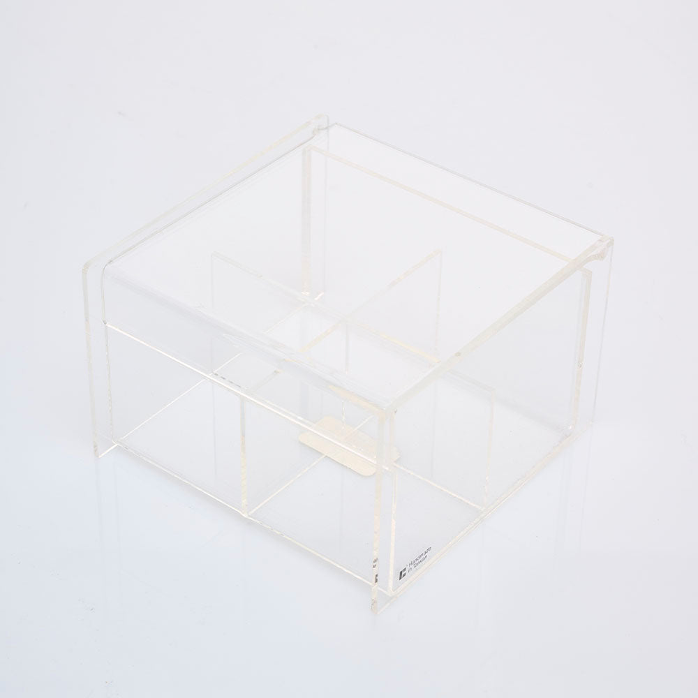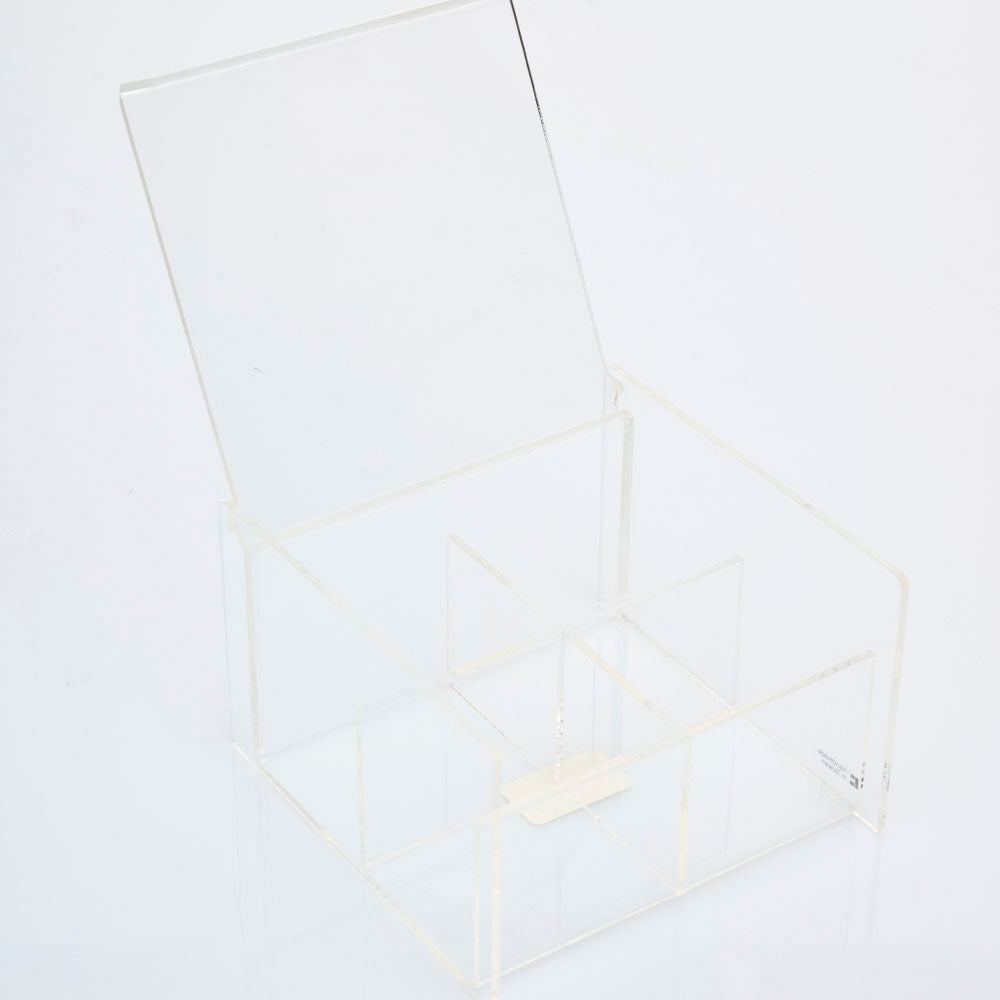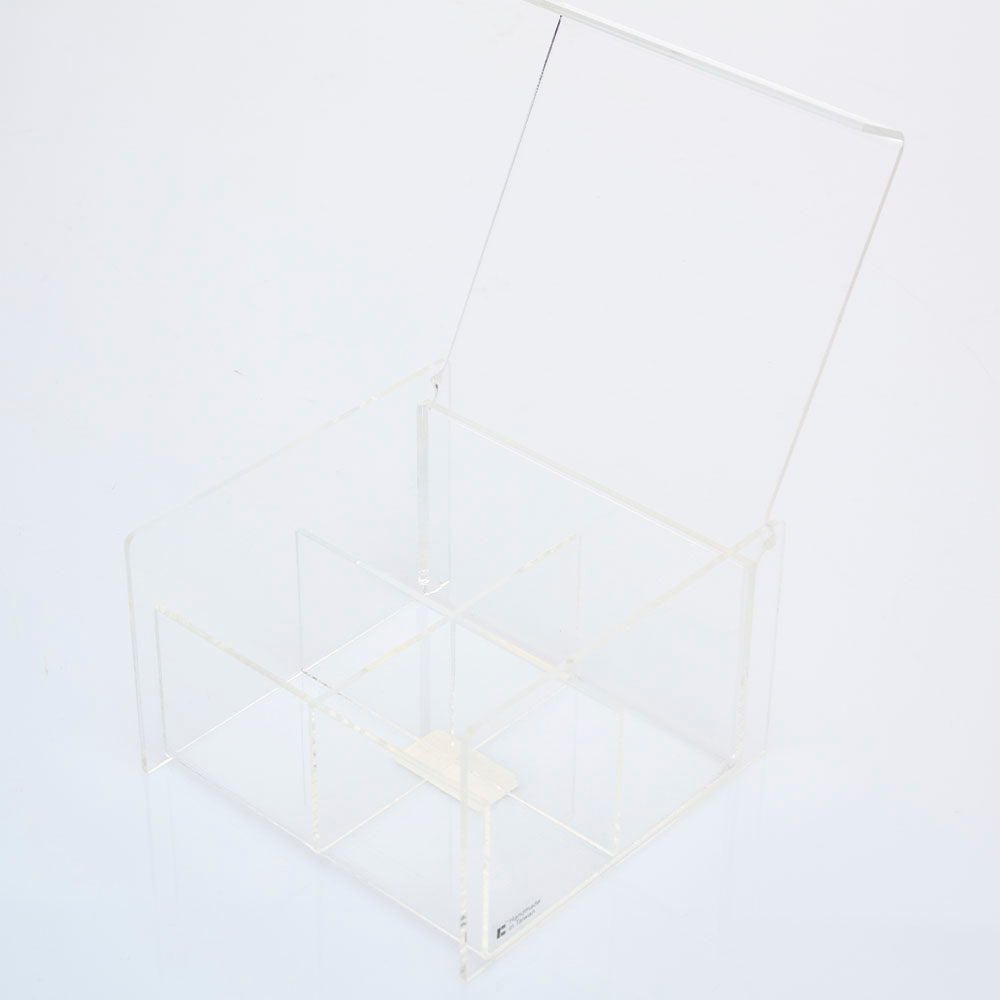 Caja de té con 4 compartimentos. Medidas base 14.5 x 15 cm, altura 9 cm.