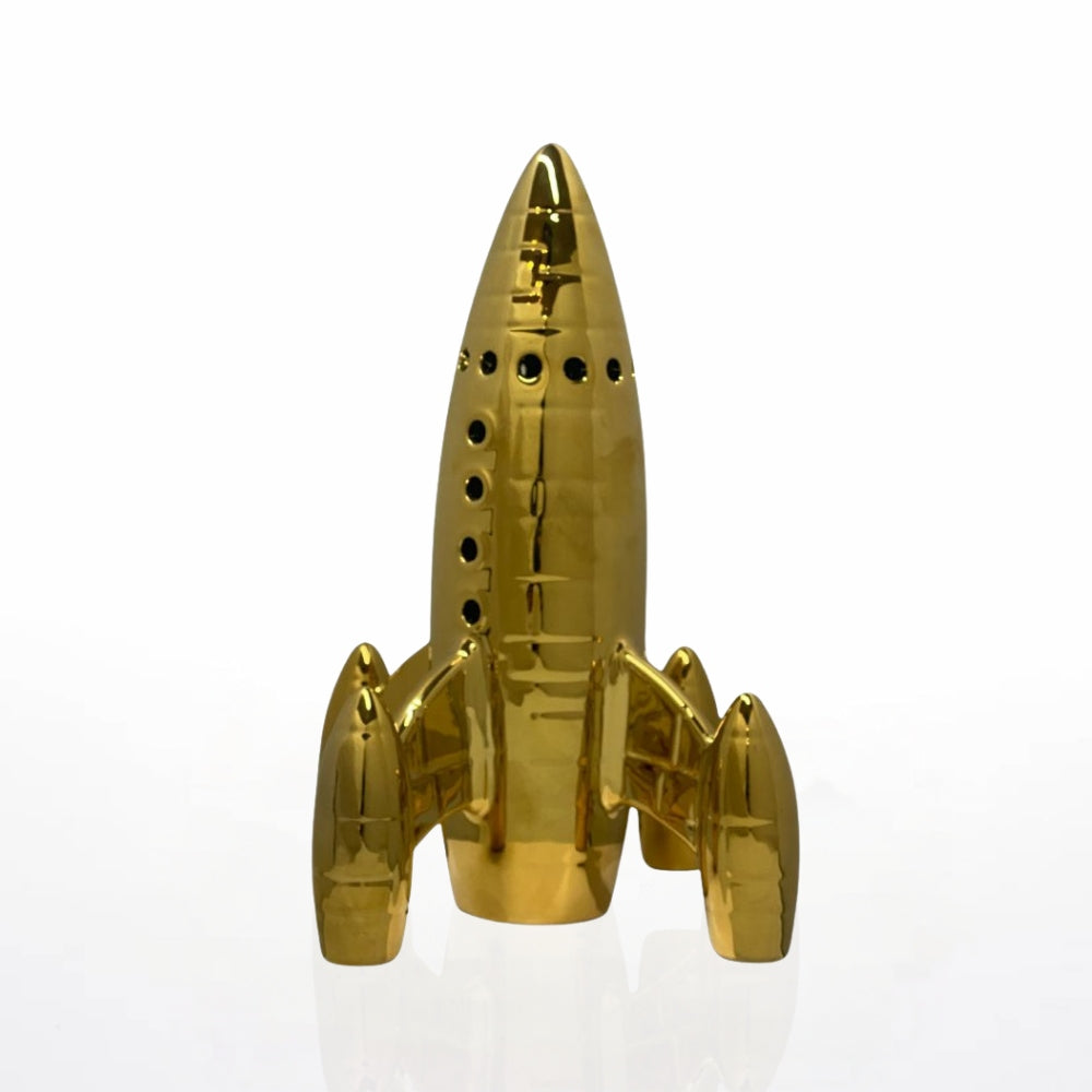 Dale un toque futurista a tu hogar con esta impresionante figura decorativa de cohete, elaborada en cerámica con un acabado dorado metálico que aporta elegancia y modernidad. Con unas medidas de 30 x 18 cm, es ideal para destacar en repisas, escritorios o mesas auxiliares, convirtiéndose en el centro de atención de cualquier espacio. Su diseño detallado y brillante lo hace perfecto para amantes de la decoración original y de inspiración espacial.