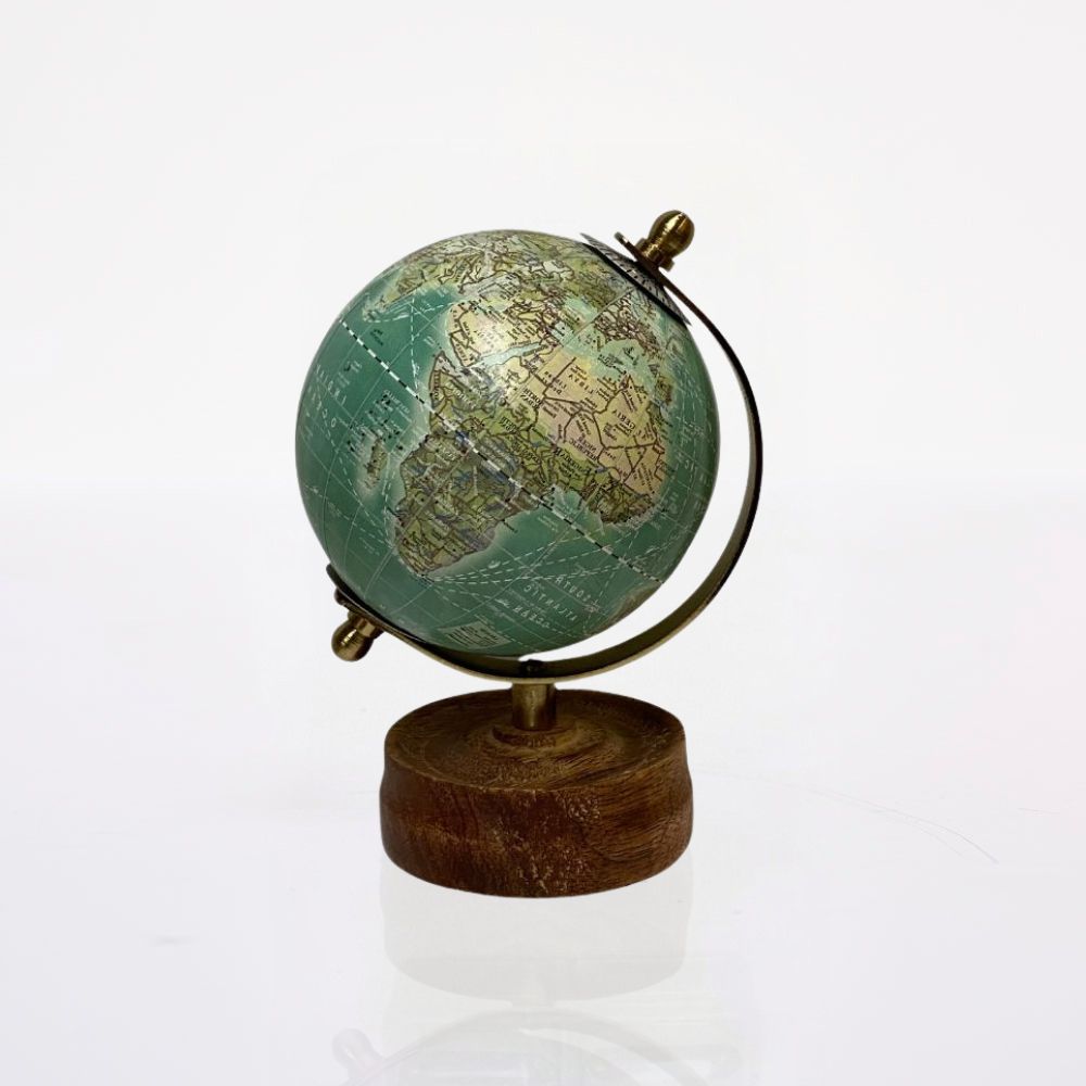 Este elegante globo terráqueo decorativo de 14 x 10 cm combina un diseño clásico con un toque moderno gracias a su base y marco en acabado dorado. Su esfera en tonos claros con detalles geográficos en dorado crea un estilo sofisticado y versátil, ideal para dar un aire de distinción a escritorios, repisas o mesas auxiliares.