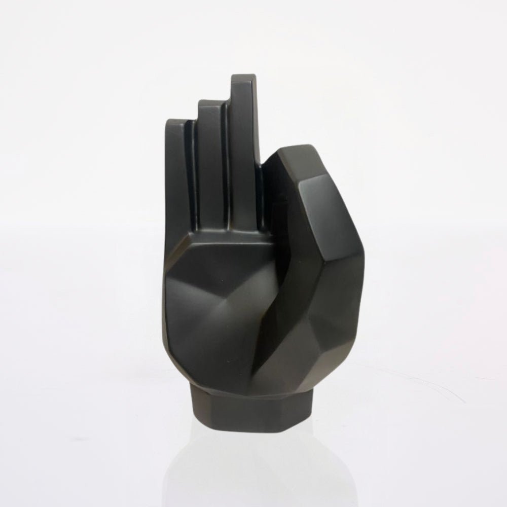Figura decorativa en forma de mano haciendo el símbolo ok, elaborada en resina de alta calidad con acabado moderno en color negro mate. Su diseño geométrico y minimalista le da un toque contemporáneo ideal para espacios modernos, oficinas o salas de estar. Con medidas de 22 x 11 cm, es una pieza versátil y llamativa que transmite estilo y personalidad, perfecta para complementar estanterías, escritorios o mesas auxiliares