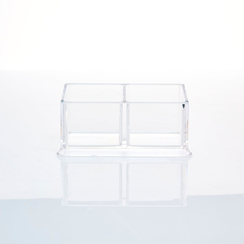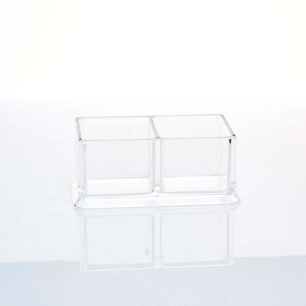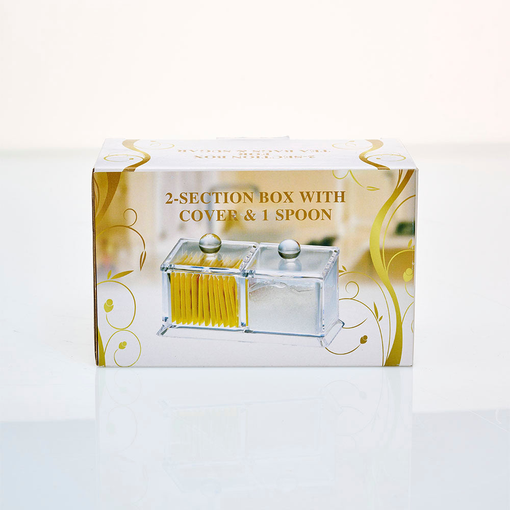 Caja de acrílico con dos apartados para almacenar tés. Medidas 17 cm de base, 7 cm de altura, 7 cm de ancho.