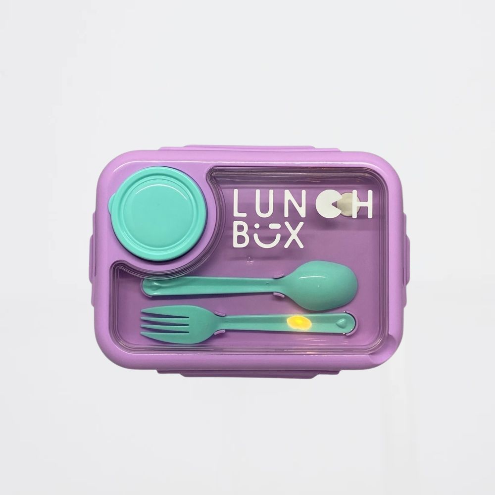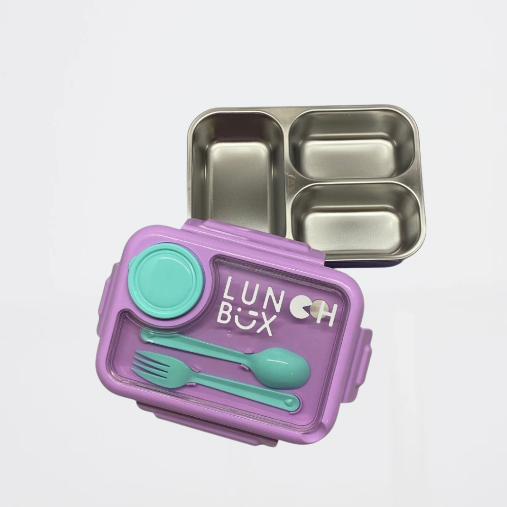 Haz que la hora del almuerzo sea divertida y organizada con esta lonchera de acero inoxidable. Su diseño colorido en tonos morado y turquesa la convierte en la opción ideal para niños y adultos que buscan practicidad sin perder el estilo. Cuenta con tres compartimentos internos para separar alimentos, un pequeño contenedor con tapa ideal para salsas o snacks, y un juego de cubiertos reutilizables (tenedor y cuchara) incluidos en la tapa.