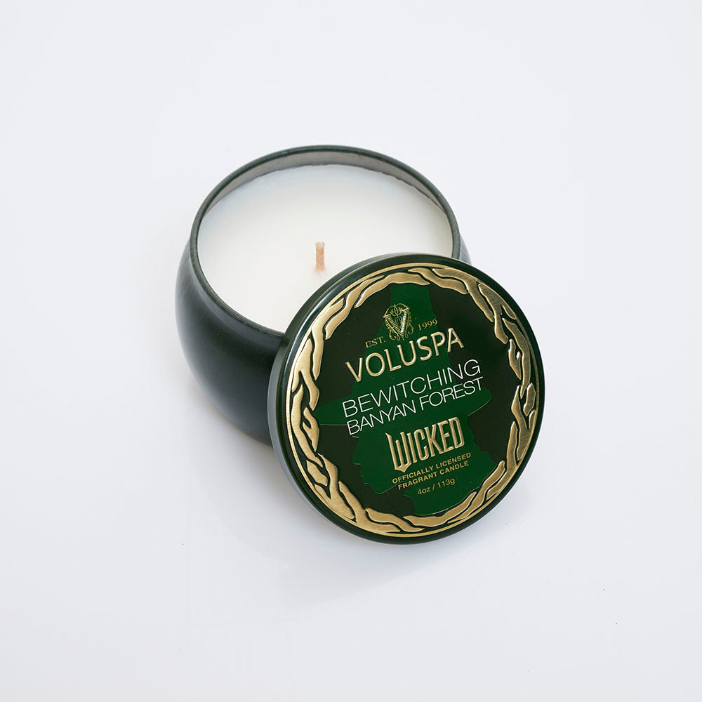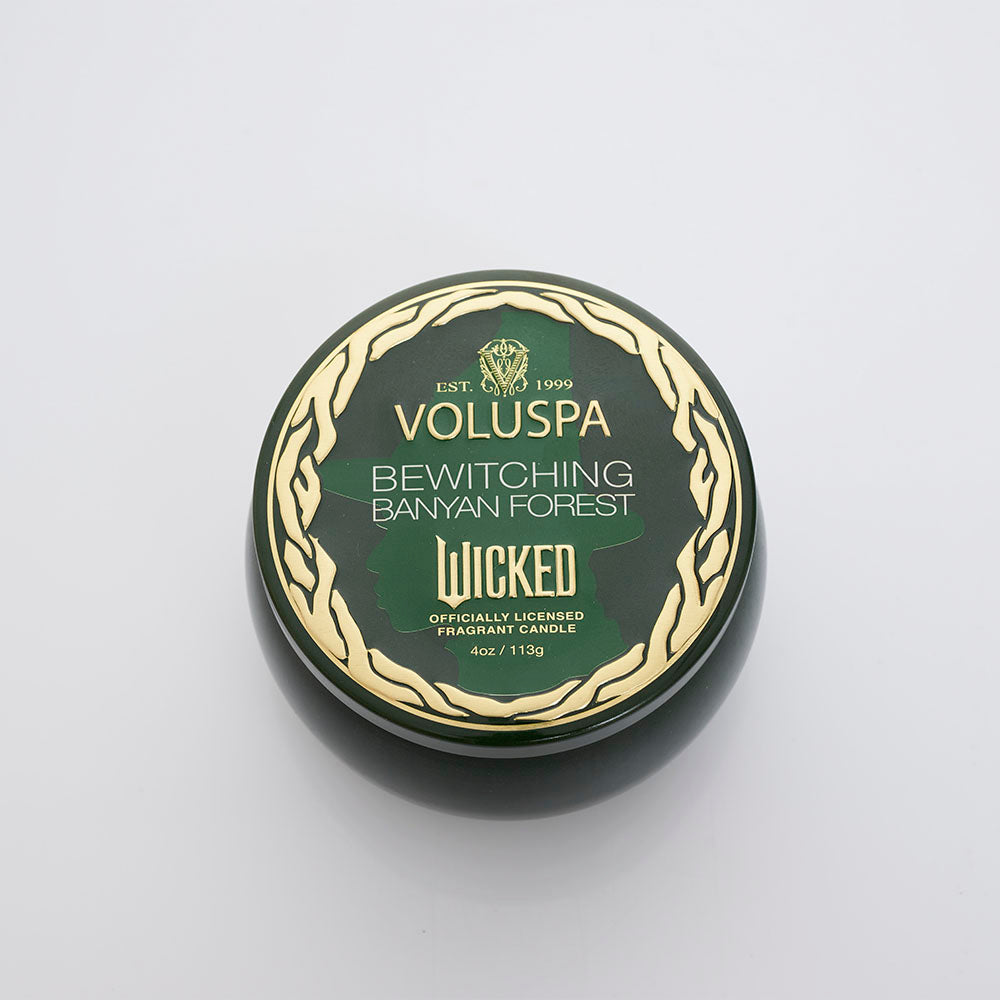 Vela de lata de edición limitada de wicked de 4 oz. Tiene notas boscosas y cálidas. Duración promedio de 25 horas.